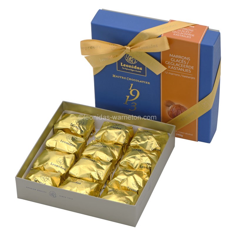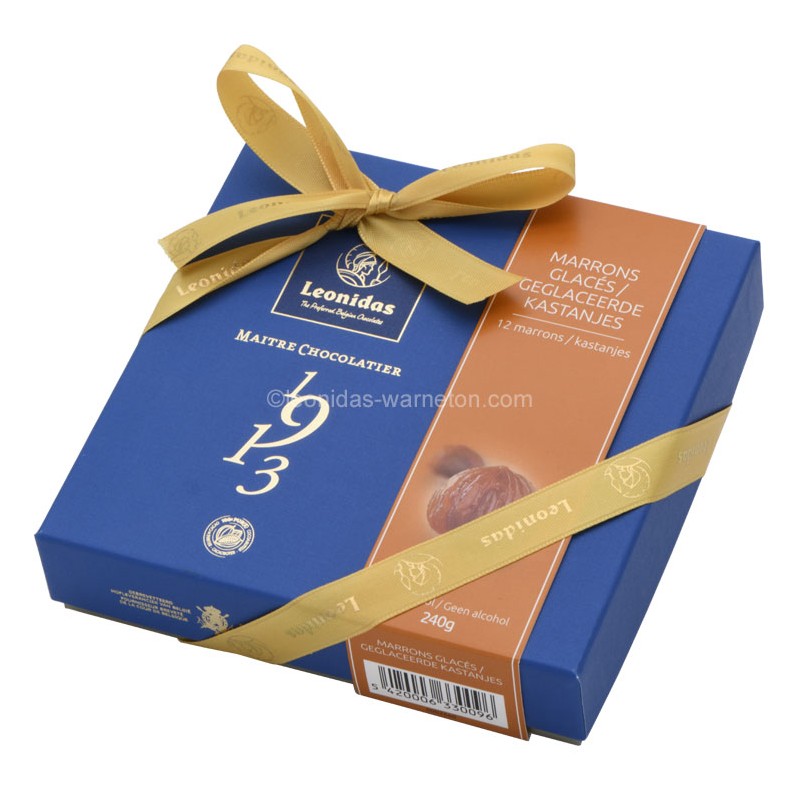 Coffret cadeau Leonidas garni de 12 marrons glacés emballés. Ces marrons glacés frais vous apportent une incroyable fraîcheur en bouche. Confisage traditionnel et artisanal, à base de glucose de blé et gousse de vanille de bourbon de Madagascar.